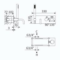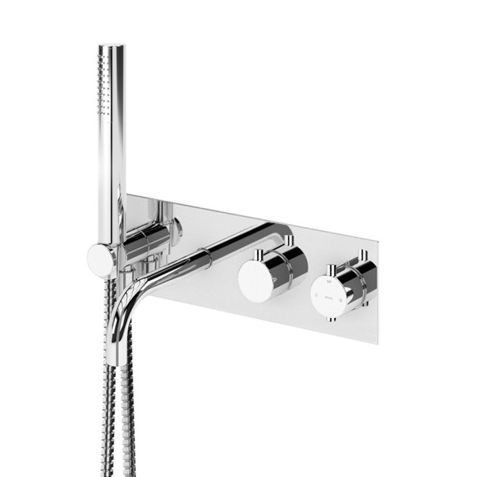 • Komplekte: maišytuvas su potinkiniu termostato mechanizmu, vonios snapeliu ir rankinio dušo komplektu;