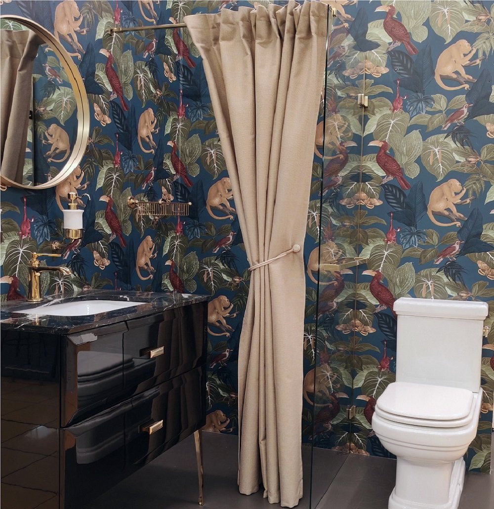 Prabangi vonios užuolaida 100-150cm pločio | Rudas su smulkiu tamsiu raštu audinys.