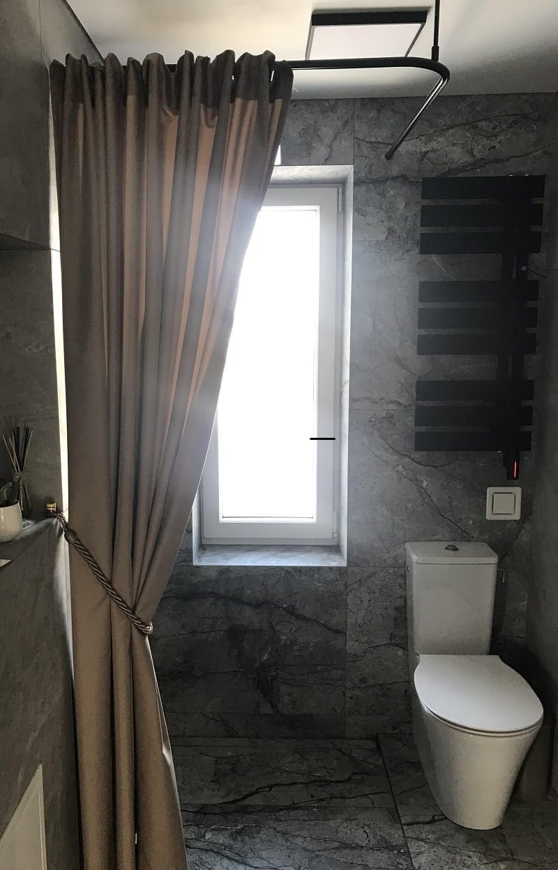 Dar vienas šio vonios kambario elementas – dušo užuolaidos karnizas, taipogi gamintas Deco Home komandos. Jų pasirinkimus galite peržiūrėti čia.