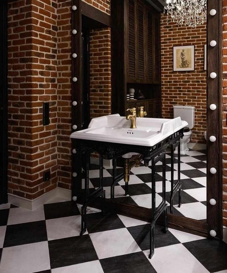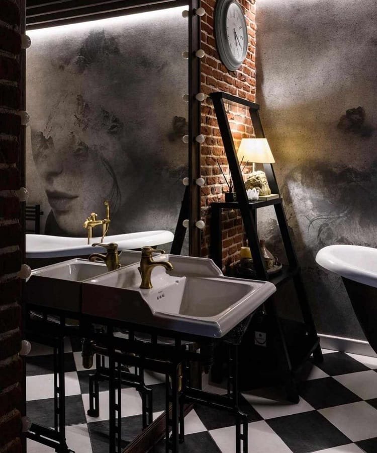 Klasikinis vonios kambarys… BET… kiek kitoks vonios kambarys! Tamsūs atspalviai, didžiulis veidrodis (netipinėje vietoje – už praustuvo), židinys bei kitos interjero detalės padėjo sukurti kiek kitokios klasikos vonios interjerą.