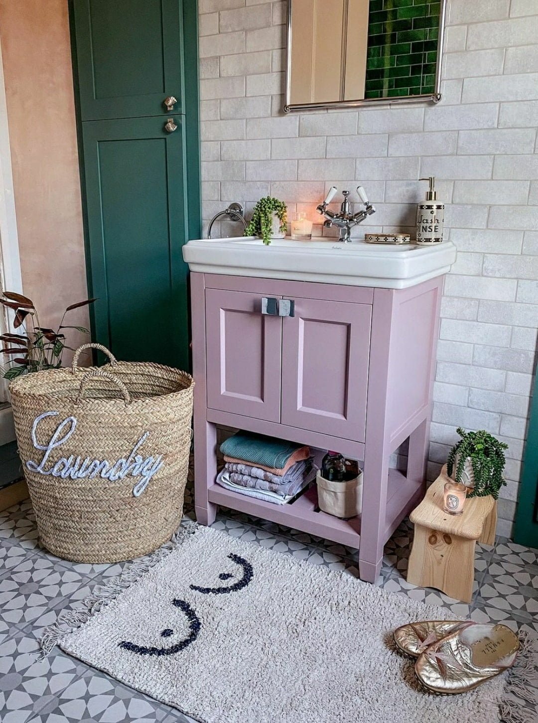 Angliškos klasikos stiliaus vonios kambarys, kuriame puikiai priderintos ryškesnės spalvos. Taipogi vonios kambariui išskirtinumo suteikia kampinė vonia ant kojyčių, kurį atstoja ir dušo zoną, bei rožinės spalvos spintėle prasutuvui.